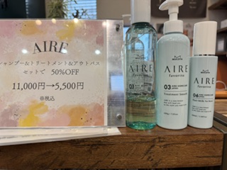 こんにちは直江です。今回は商品紹介を真面目にしていきます(*'ω'*)AIRE アイレ凄くいい匂いのするシャンプーと洗い流さないトリートメントになってます。性別関係なく使いやすいです。シャンプーを流した後だけでもサラサラ感を感じやすいです。個数限定なので気になる方は是非ご来店ください(≧∀≦)